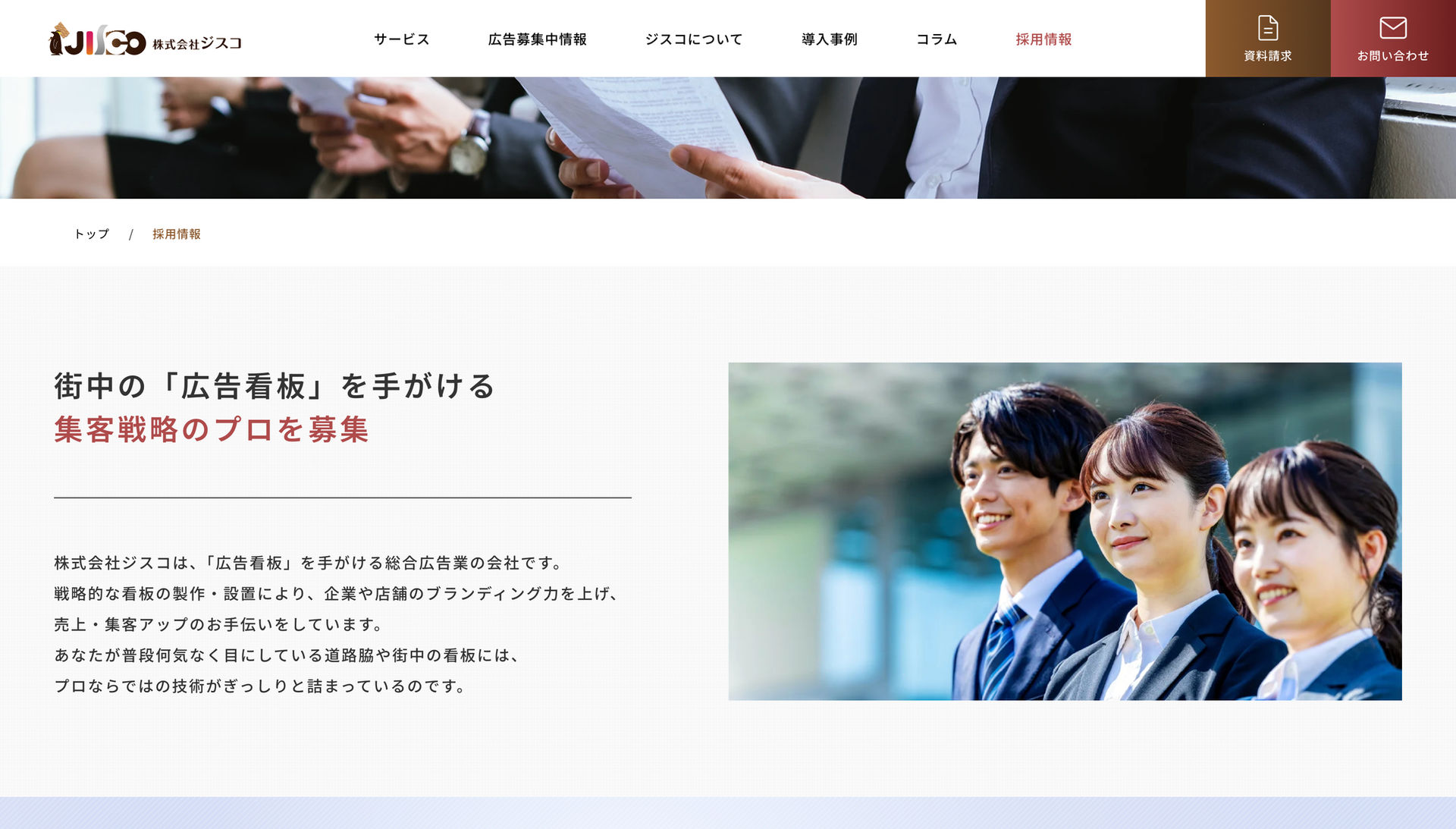 千葉県内を中心に総合広告代理業から、企画デザイン、製作施工、保守・メンテナンスまでを手がける屋外広告看板・デジタルサイネージ製作会社様のコーポレートサイトリニューアルを行いました。これまでのサイトは、情報が錯綜していたり希薄な状態だったため、一からインタビューや情報の整理を行い、ターゲットに向けた適切な情報伝達を促すような導線設計をいたしました。また、資料請求や事例の整理を行い、複数の更新作業も簡単・簡潔に行えるノーコードCMS基盤を採用し、多忙なバックオフィス業務の中でも対応できるような体制も整えました。